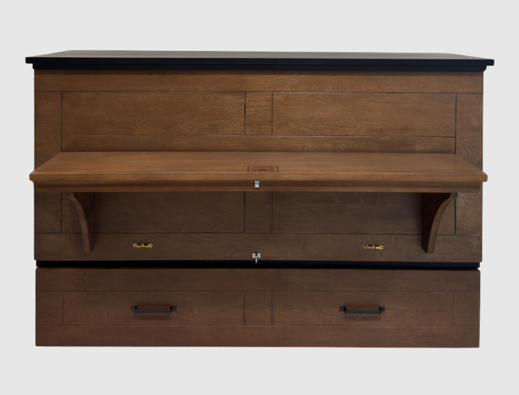The Studio Cojoba is a free-standing CabinetBed that transforms into a full-size sleeping surface in under 30 seconds no wall mounting or permanent installation required. Its stylized grooved panels, clean lines, and easy flip up 16″ deep desk top gives it a modern desk-cabinet look while keeping operation effortless for daily use.