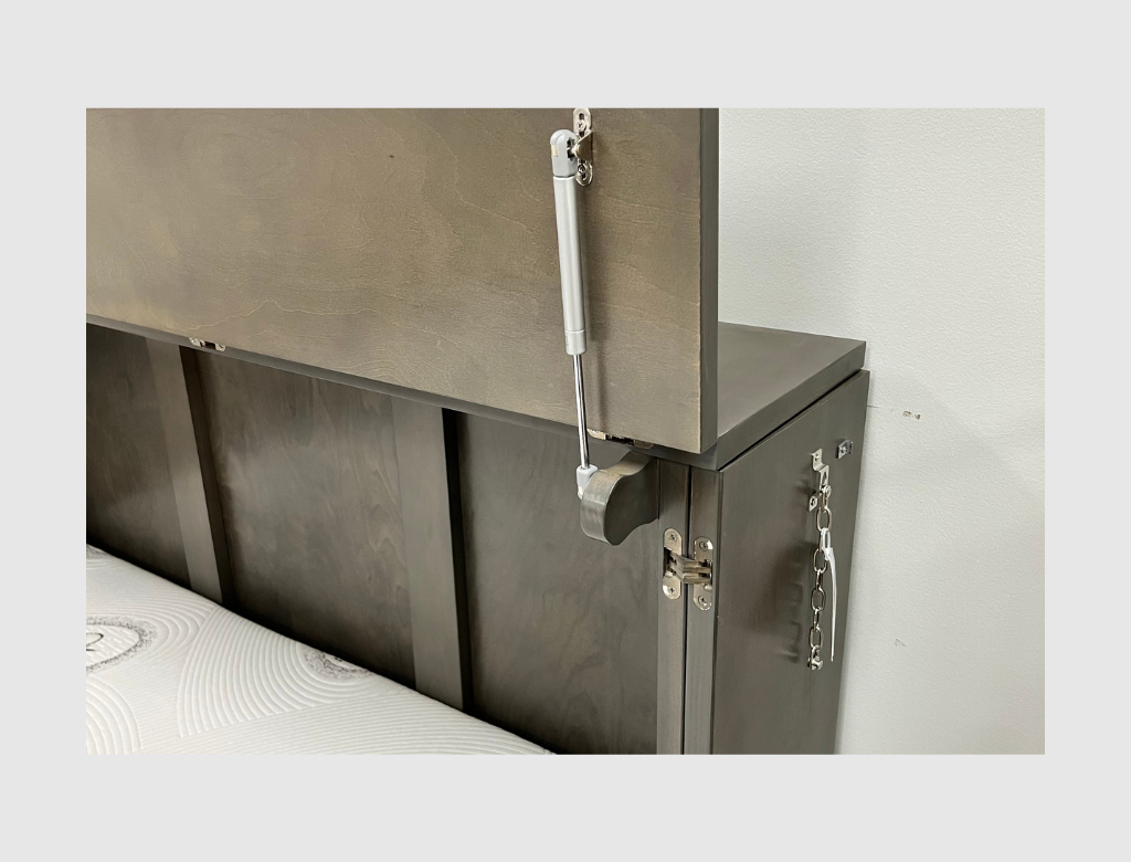 The Studio Grey is a free-standing CabinetBed that transforms into a full-size sleeping surface in under 30 seconds no wall mounting or permanent installation required. Its stylized grooved panels, clean lines, and easy flip up 16″ deep desk top gives it a modern desk-cabinet look while keeping operation effortless for daily use.